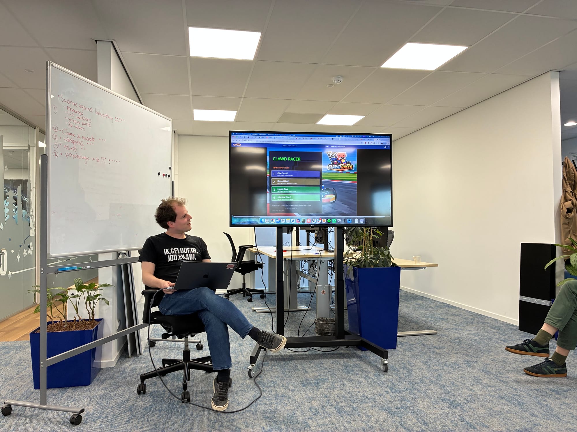 Collega Arjan bewees dat Claude niet alleen voor serieus werk ingezet kan worden. Hij bouwde een compleet retro racespel na uit zijn herinnering, inclusief muziek. Het begon met een set eisen, waarna hij stap voor stap samen met Claude het spel verfijnde: bugs oplossen, features toevoegen en uiteindelijk power-ups inbouwen zoals raketten afvuren en snelheidsboosts.