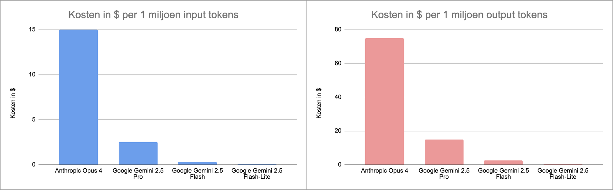 Als je de modellen op rij zet en je kijkt door de oogharen heen, dan zie je dat Opus 6x duurder is dan Pro, die zelf meer dan 8x duurder is dan Flash, die op zijn beurt weer 3x duurder is dan Flash-Lite. Opus is 150x – 180x duurder dan Flash-Lite. Dit prijsverschil rechtvaardigt een doorwrochte keuze in het bepalen welk taalmodel ingezet moet worden.