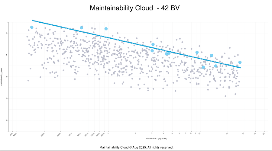 De blauwe bollen zijn producten van 42, de grijze bollen zijn producten van andere partijen uit de industrie. De verticale as geeft de onderhoudbaarheid van een product weer, bestaande uit een verzameling aan kwaliteitsmetrieken, waarvoor geldt hoe hoger de waarde, hoe beter. De horizontale as geeft een indruk van de grootte van het product. Hoe meer naar rechts, hoe meer regels code het product omvat, dus met andere woorden, hoe groter het product is.