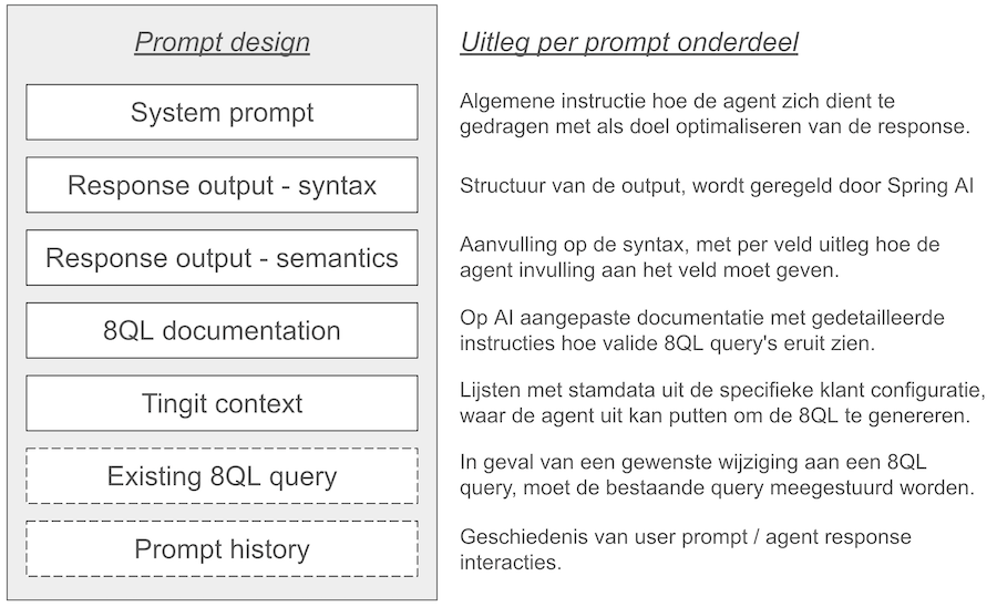 De prompt moet zorgvuldig ontworpen worden, zodat de agent alle informatie heeft die het nodig heeft om de 8QL te genereren die de vraag van de gebruiker beantwoordt. We komen uit op het volgende prompt design: